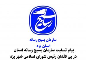 سازمان بسیج مداحان و مدیران هیئات مذهبی استان؛ این واقعه دردناک را محضر خانواده محترم، اعضای محترم شورای اسلامی شهر، ارادتمندان و مردم شریف یزد تسلیت عرض کرده، از درگاه احدیت برای آن عزیز سفر کرده غفران الهی و بازماندگان ایشان صبر و اجر مسالت می نمائیم.